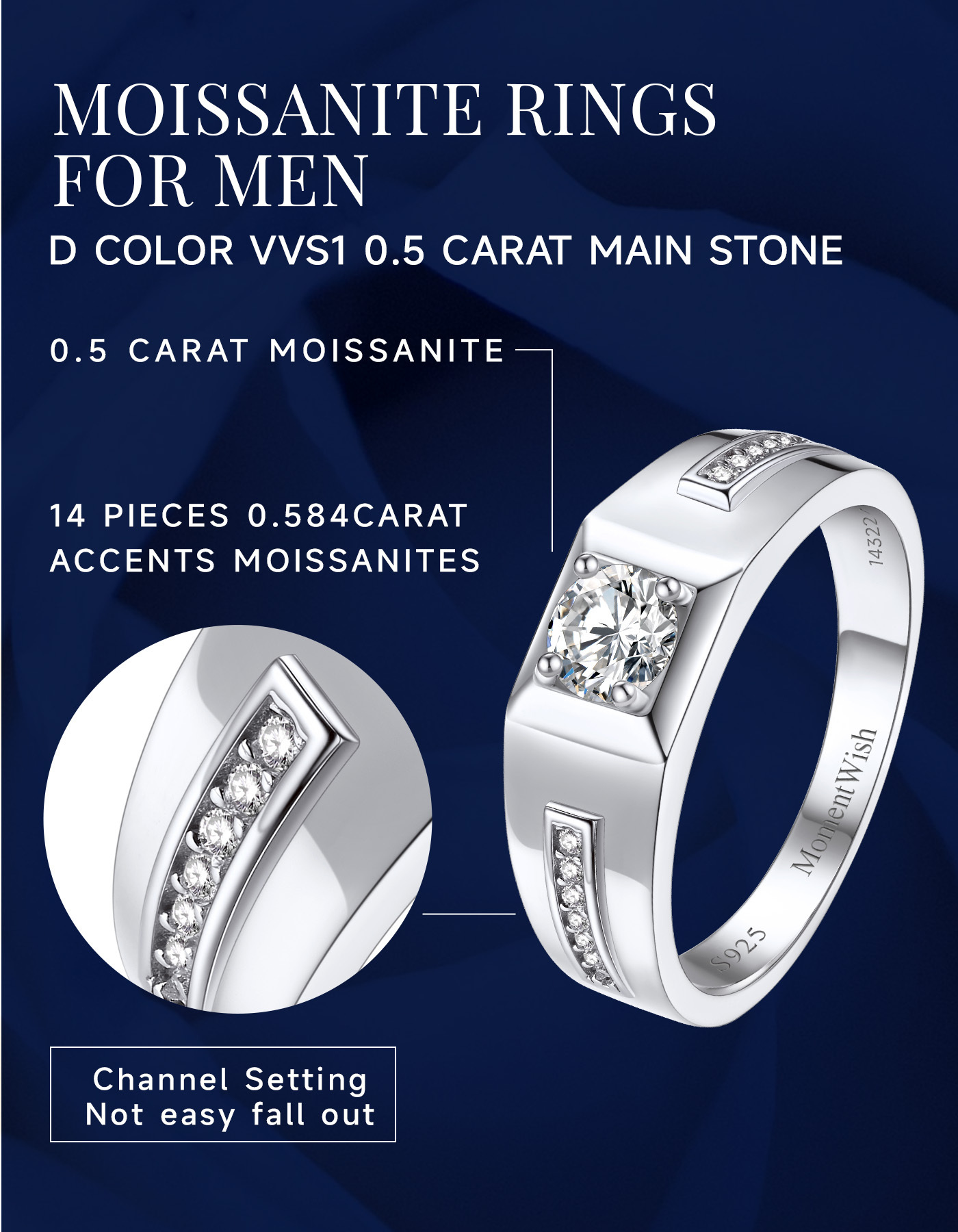 【Engraved Wedding Band】➣ Custom rings for men has sparkling 5mm 0.5 carat moissanite center stone set in a classic 4 prong setting. A ribbon of 14 moissanite diamonds lines the ring's slender shank(14*1*1mm small side stone), make the center stone look