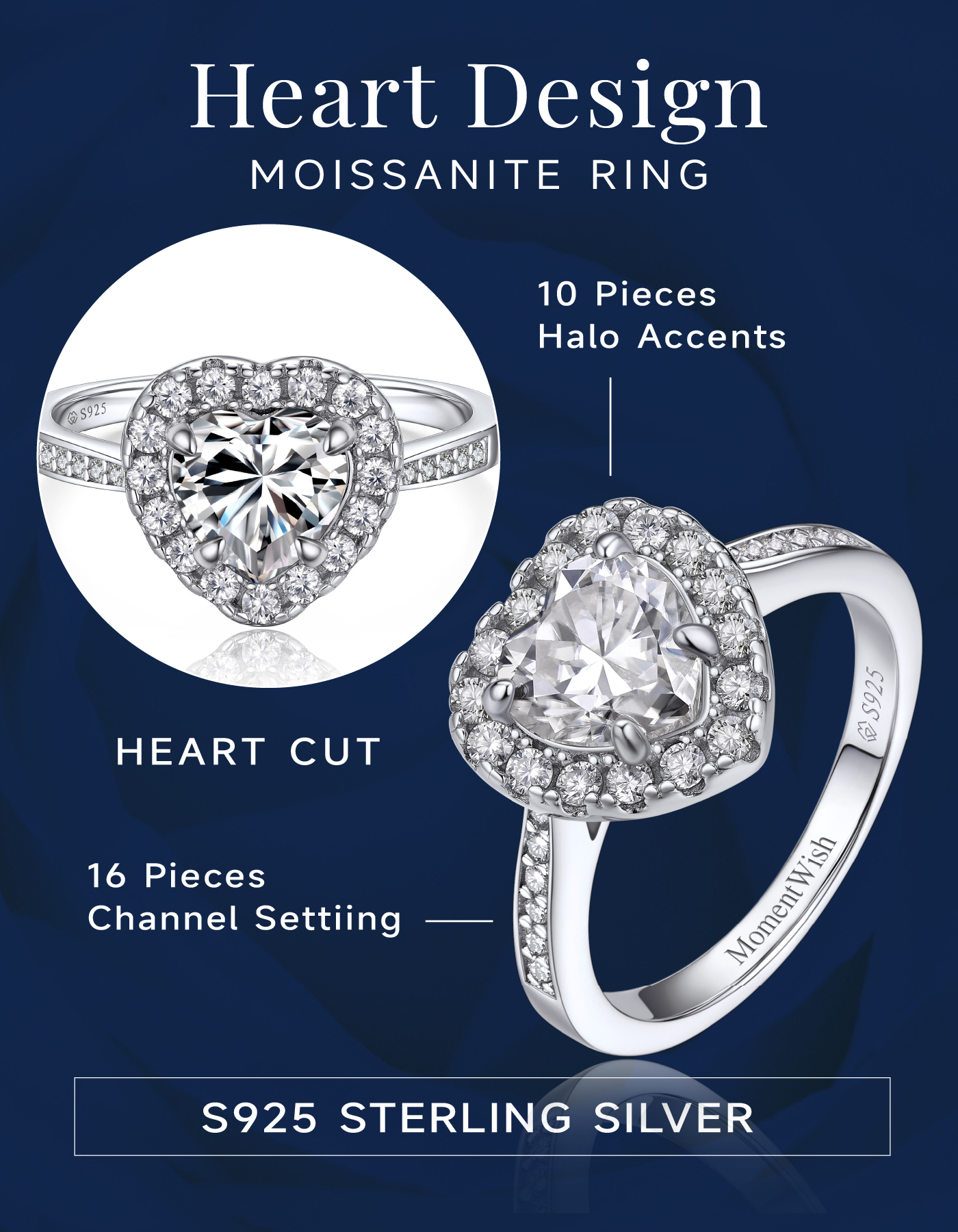 【Heart Halo Design】With a halo of micro-pave set moissanite that revolving around the 1carat heart cut moissanite stone, moissanite heart rings creates sparkly brilliance. 12 enchanting accent moissanite are set with solid 925 sterling silver. Find a perfect promise ring for women which fit his/her lifestyle or personality. This sparkling moissanite ring will catch many sights for you!