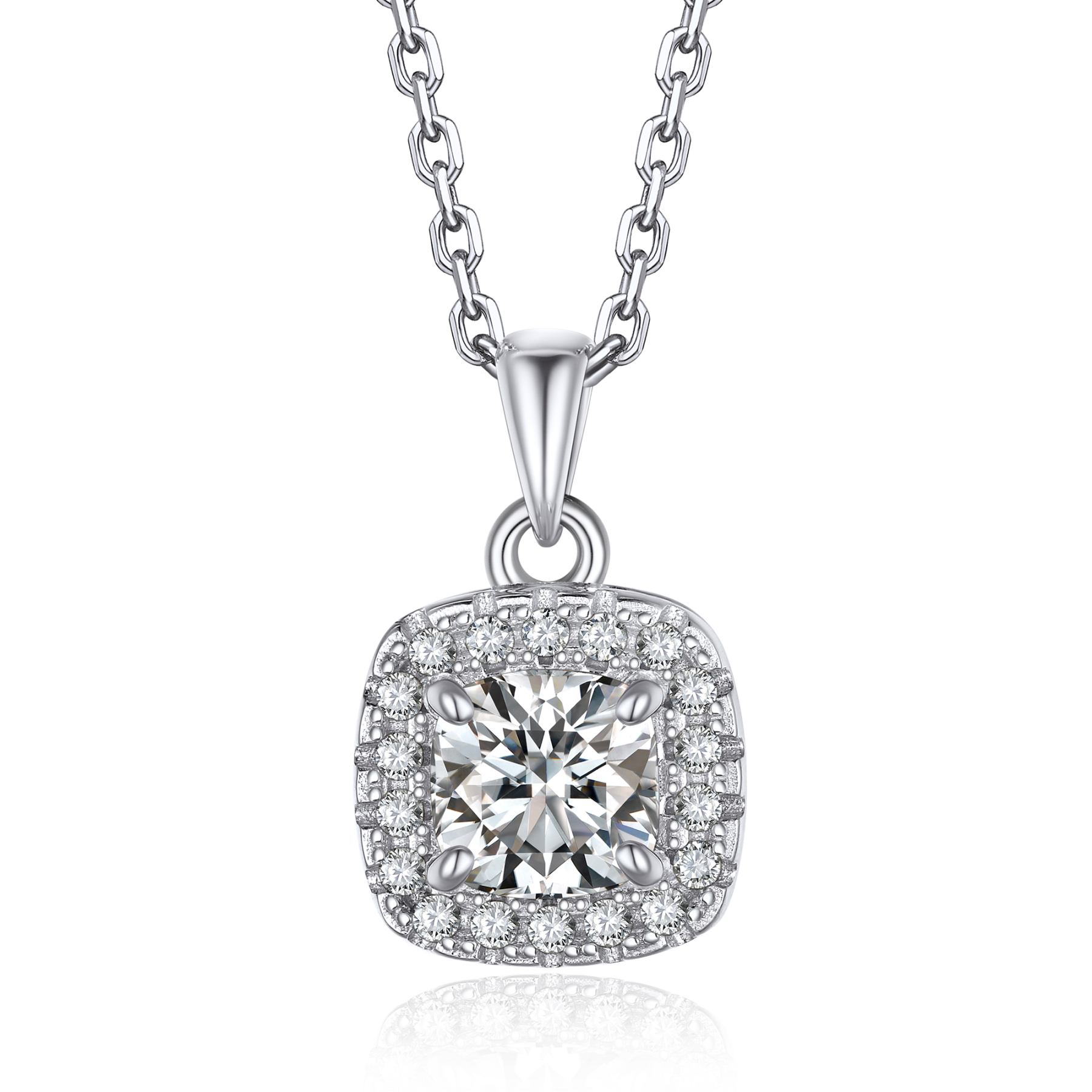 【Cushion Necklace】➣ With a halo of micro-pave set 18 moissanites that revolving around the 1 Carat centre stone 4 prong setting, creating a stunning halo effect, total 1.144ct. Cushion necklace is linked to marriage, happy occasions, and love. Cushion cut pendant looks soft and romantic without tough edges, is very popular among ladies and women.