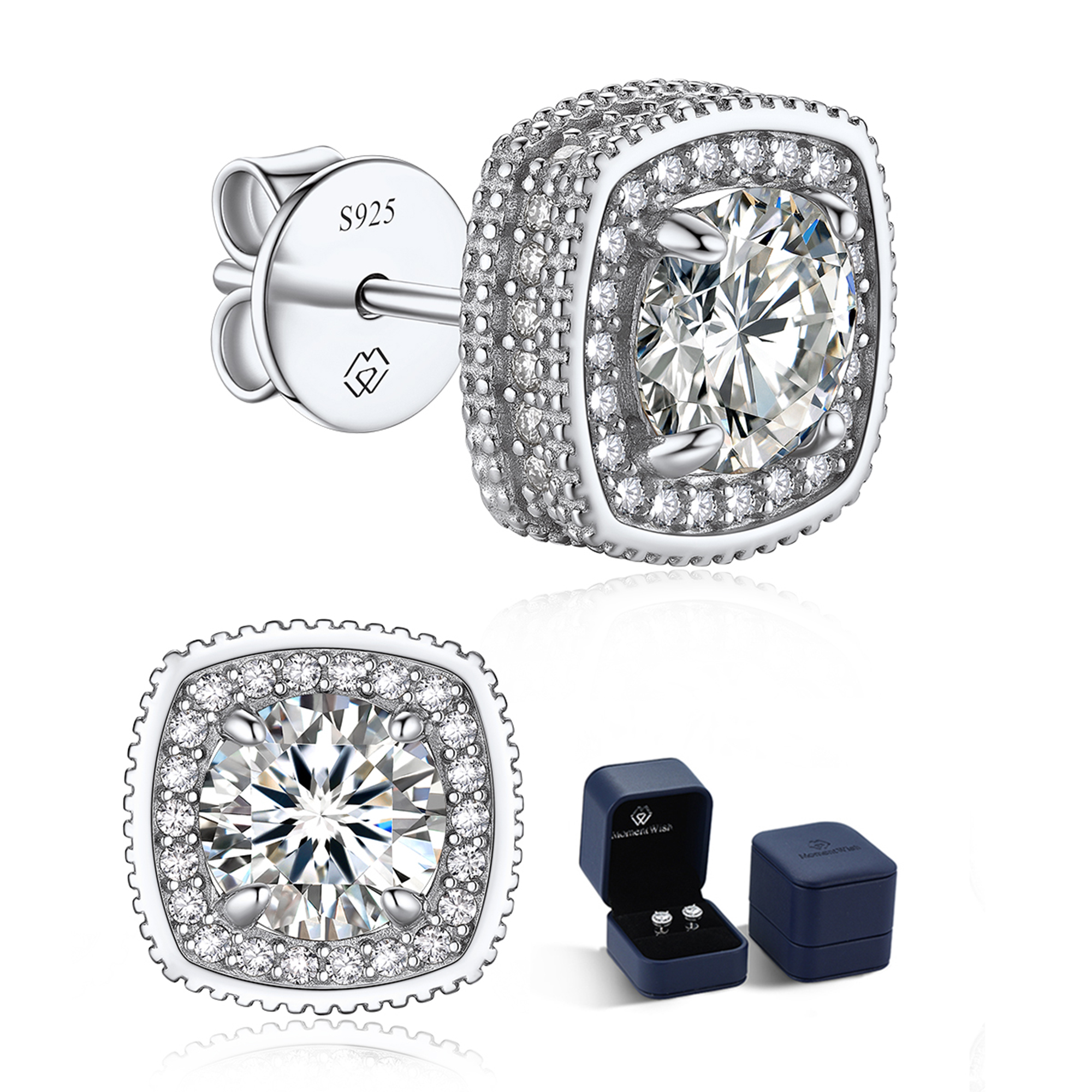 Total 2.96 carats/pair(each 1.48ct). This cushion frame halo stud earrings are popular choice for any occasion such as birthday gift, valentine's day gift.