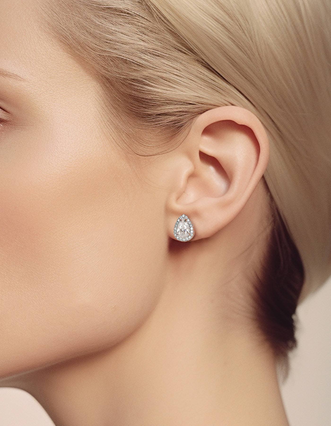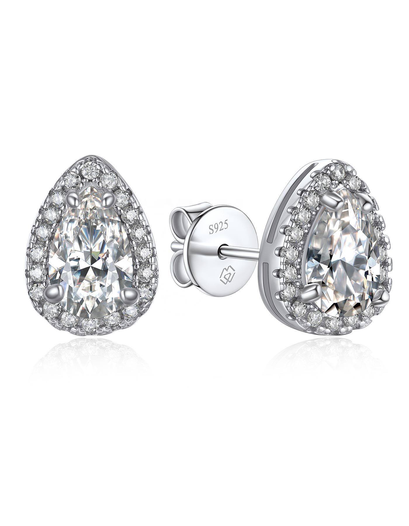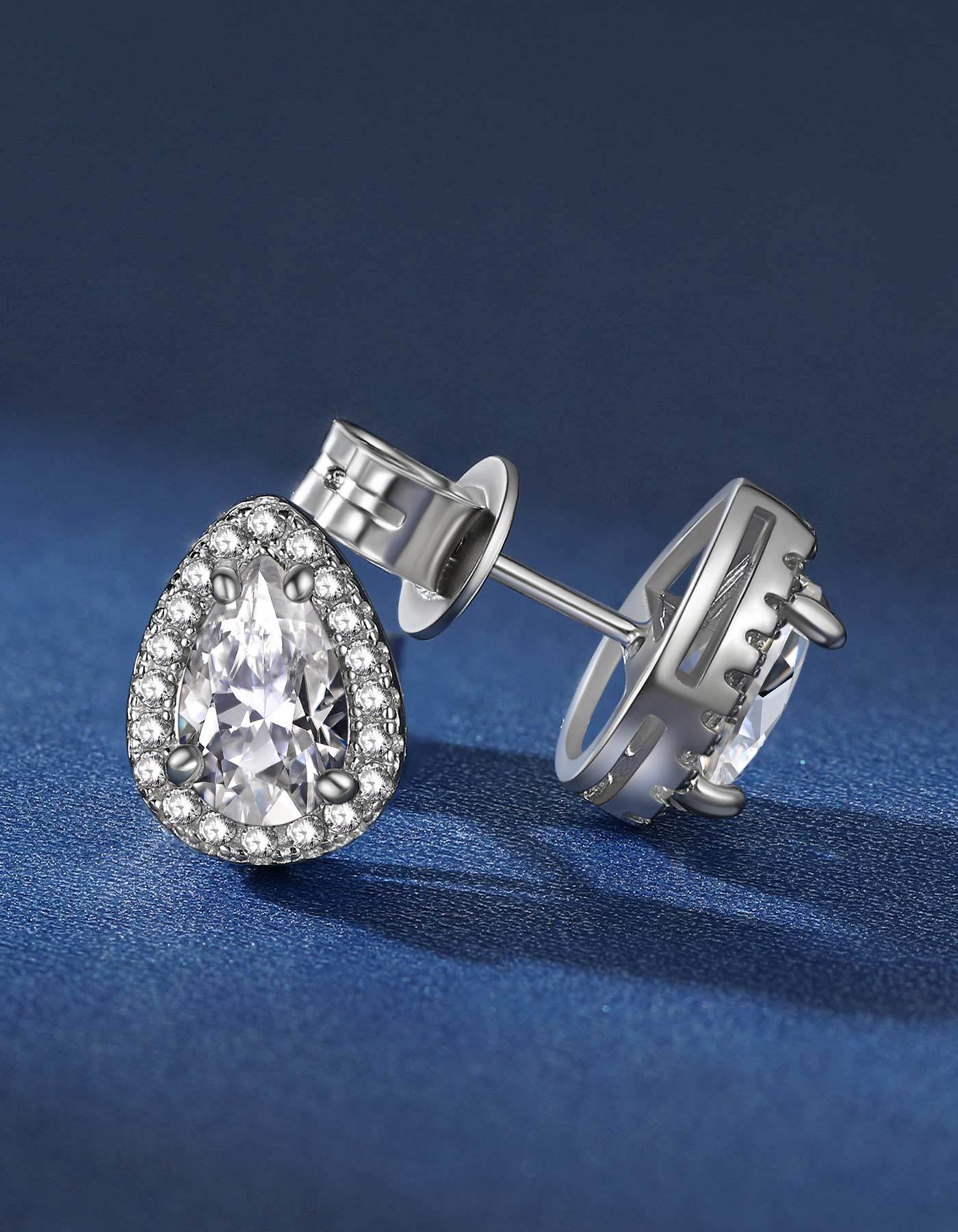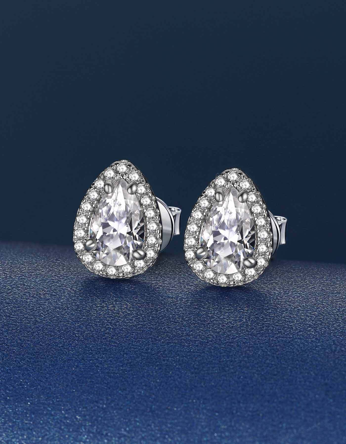 These moissanite earrings feature brilliant pear cut center moissanite diamond, surrounded by a halo of pavé-set side stone accents, giving the appearance of a larger center moissanite. This moissanite pear cut stud earrings is adopted upgraded plum blossom and excellent polished craft, more sparkling and clean.