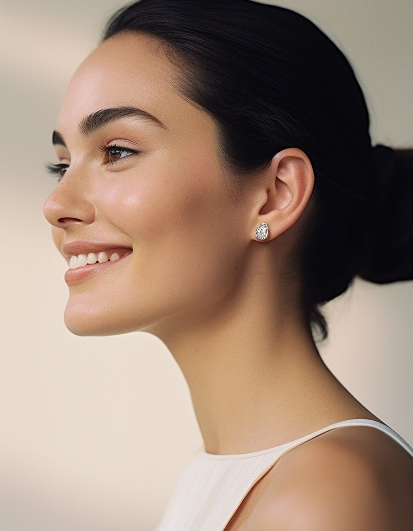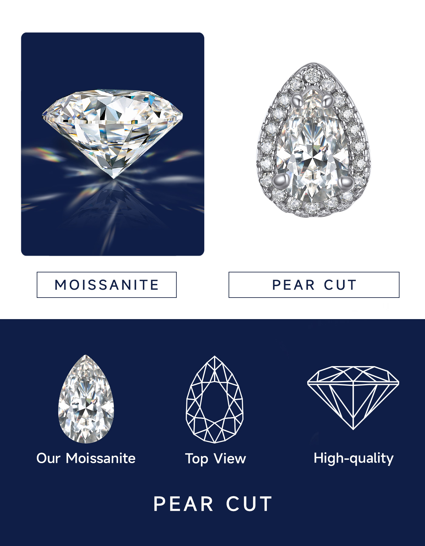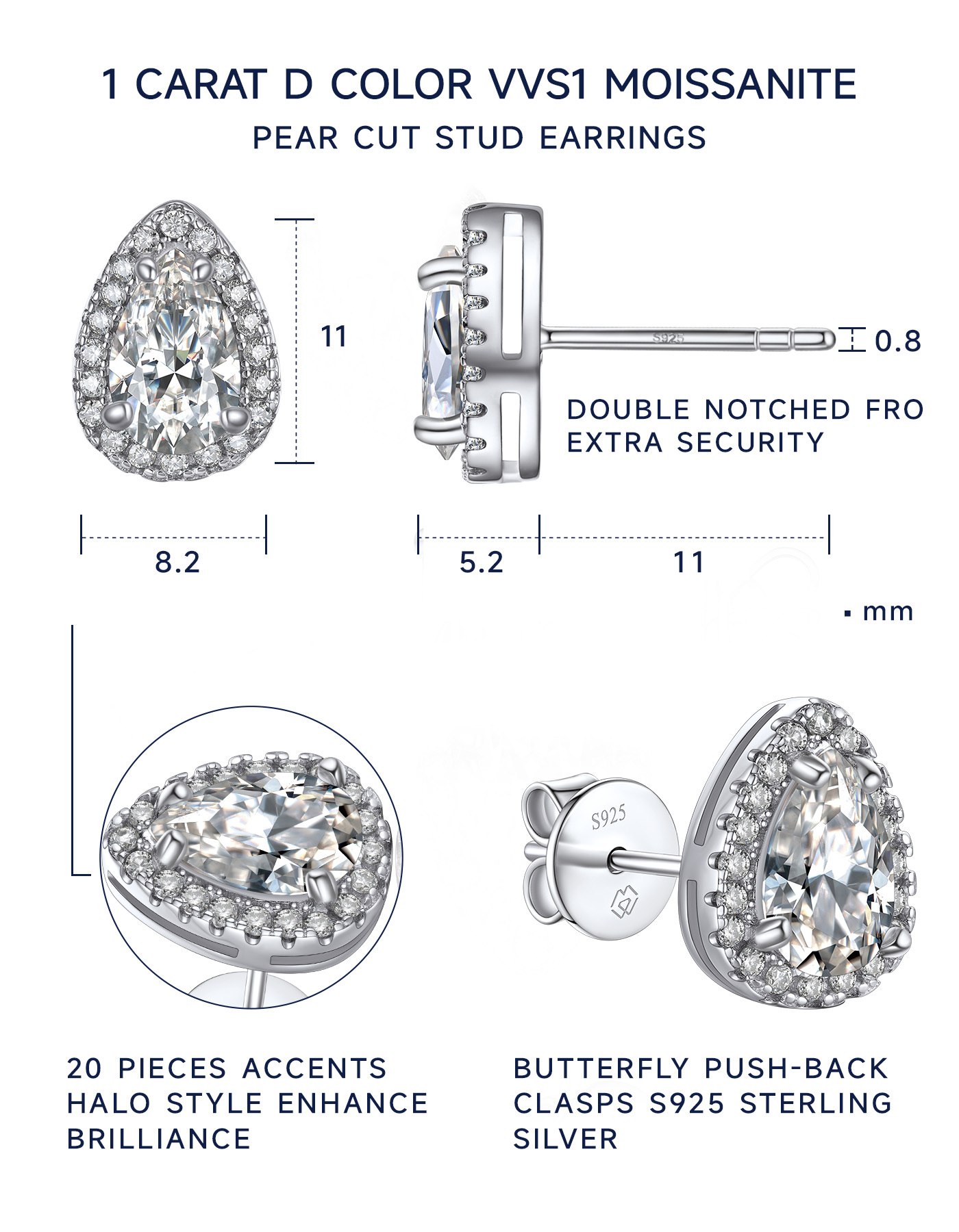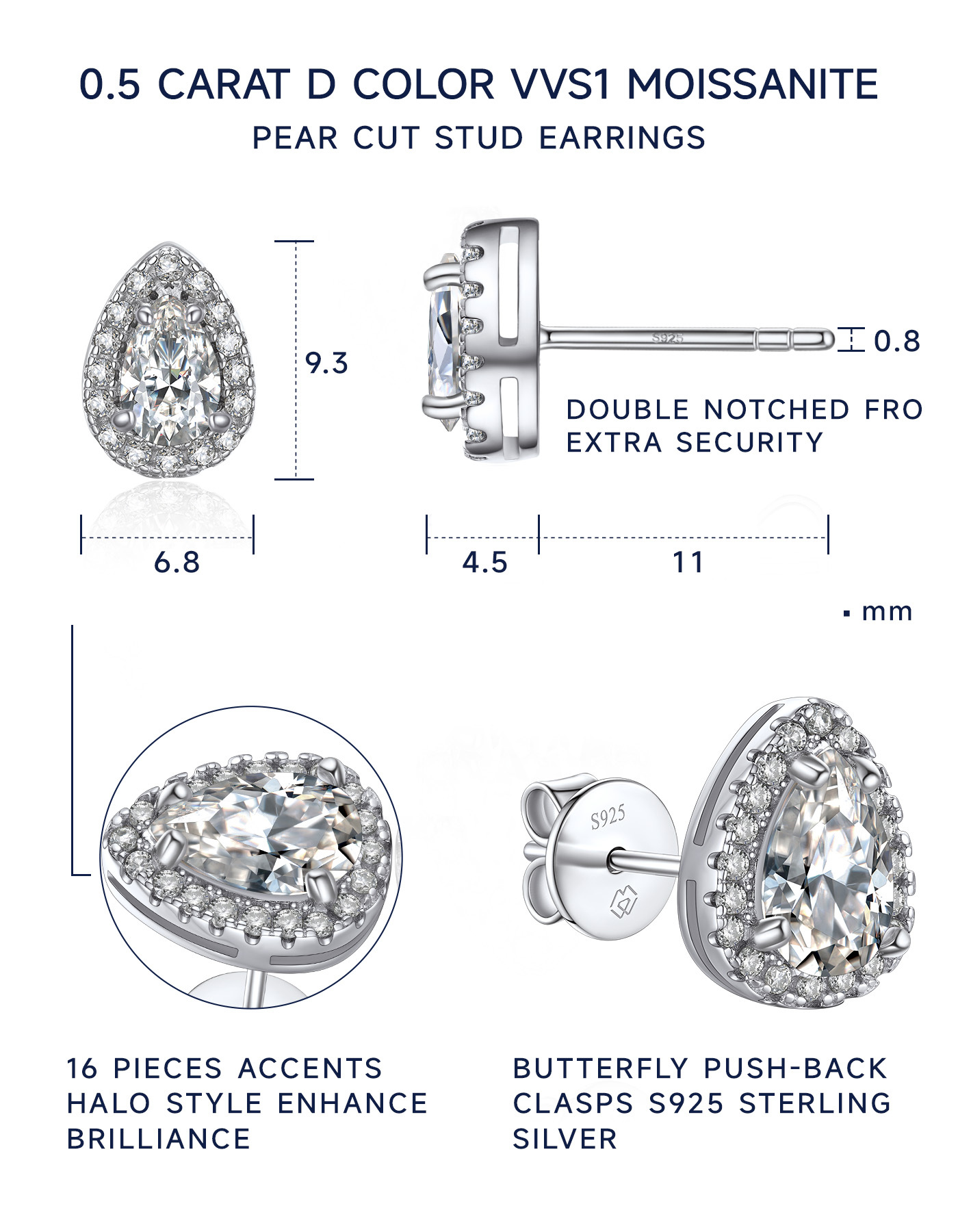 These moissanite earrings feature brilliant pear cut center moissanite diamond, surrounded by a halo of pavé-set side stone accents, giving the appearance of a larger center moissanite. This moissanite pear cut stud earrings is adopted upgraded plum blossom and excellent polished craft, more sparkling and clean.