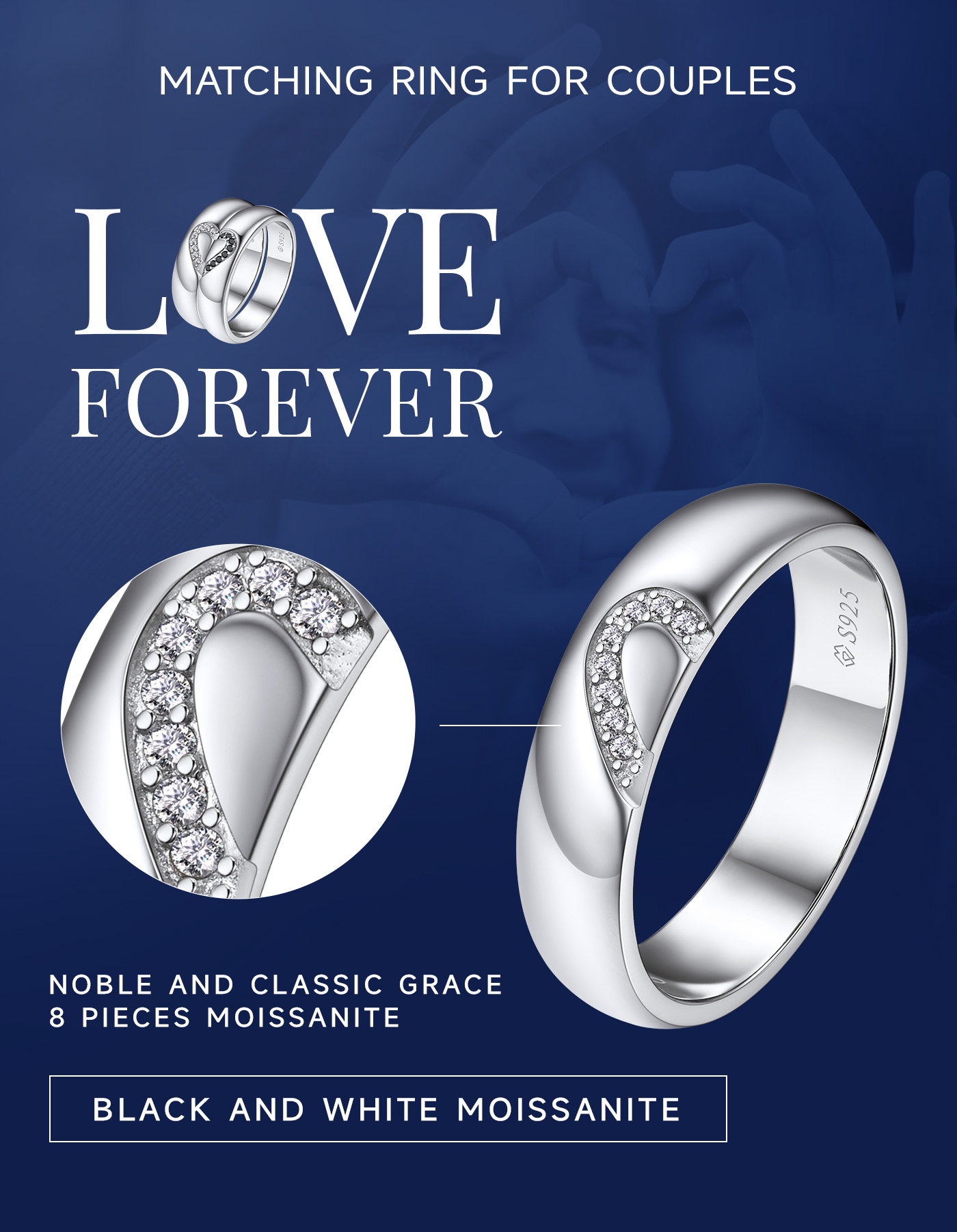 【Best Moissanites】➣Our matching half heart rings are made with sparkling moissanite(each ring has 8 pieces). Moissanite wedding band has more colored flashes of light than diamond ring. Also moissanite is the second-hardest material used a gemstone.Its extremely resistant to scratching. Moissanite engagement ring is a great chioce for daily wear, work or travel.