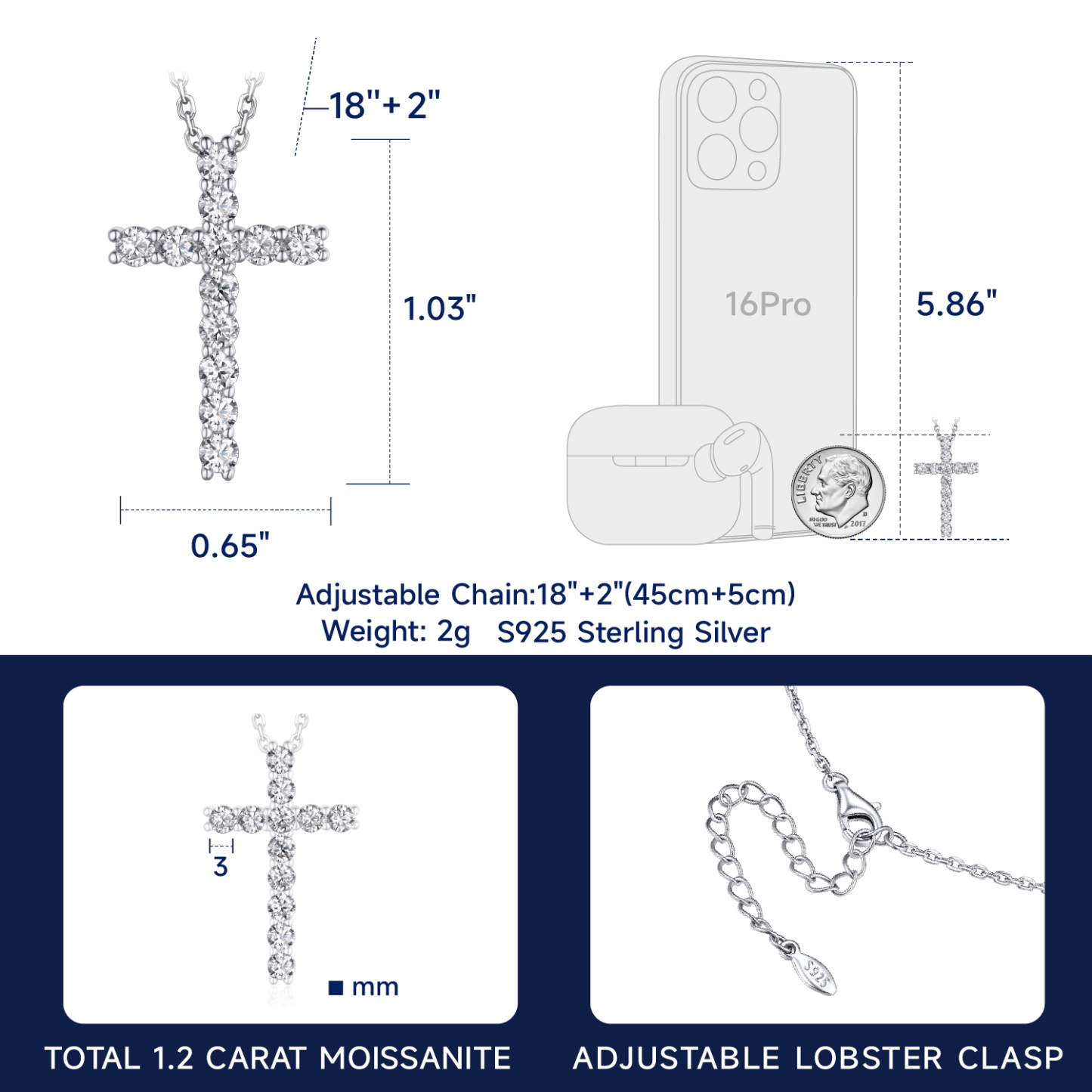 【Excellent Craft】➣ Crafted from S925 sterling silver, this cross charm necklace for women is hypoallergenic and perfect for sensitive skin. Its meticulously polished finish ensures lasting brilliance, while the delicate craftsmanship makes the silver cross pendant shine elegantly; Cross pendant: 1.03''x0.65''(26.3x16.7mm); Chain length:18''+2'' (45+5cm)