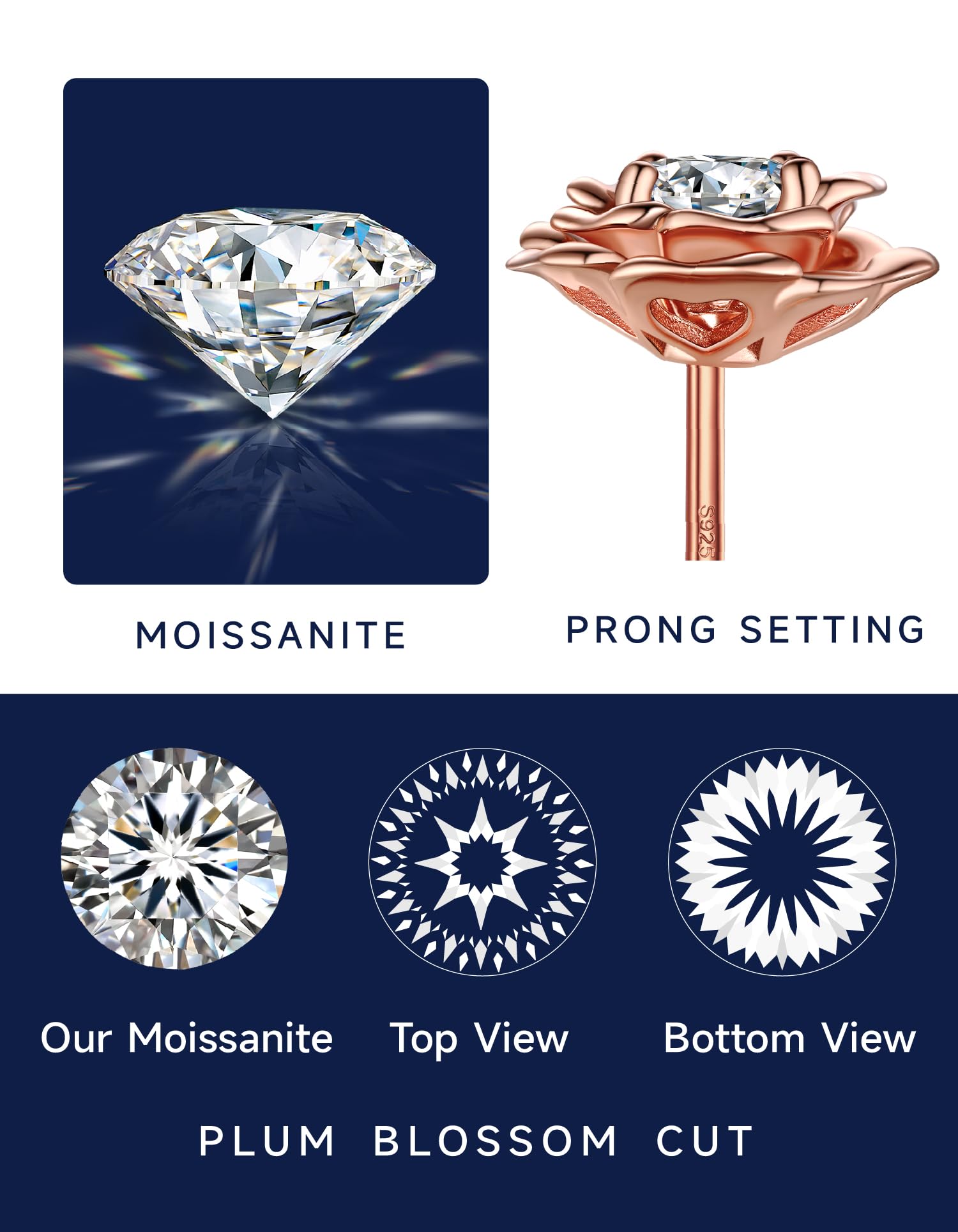 【Flower Earrings】➣ This unique earrings is composed of elegant rose and timeless moissanite, representing passion, romance, and eternal love. The rose stud earrings is made of D color VVS1 moissanite(5.5mm/0.5 carat, total 1 Carat) and 14K rose gold plated sterling silver. A classic and elegant style that fits any occasion.