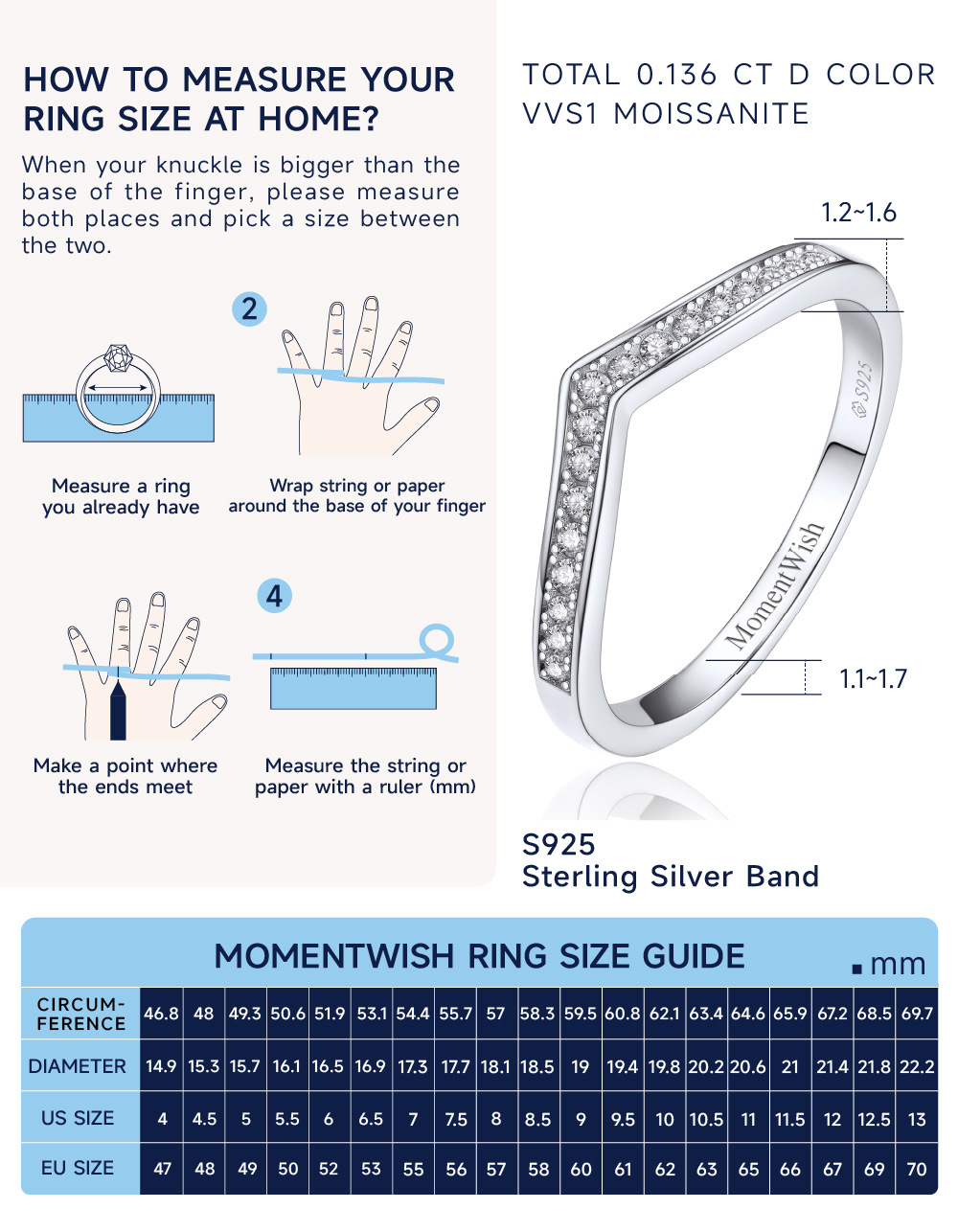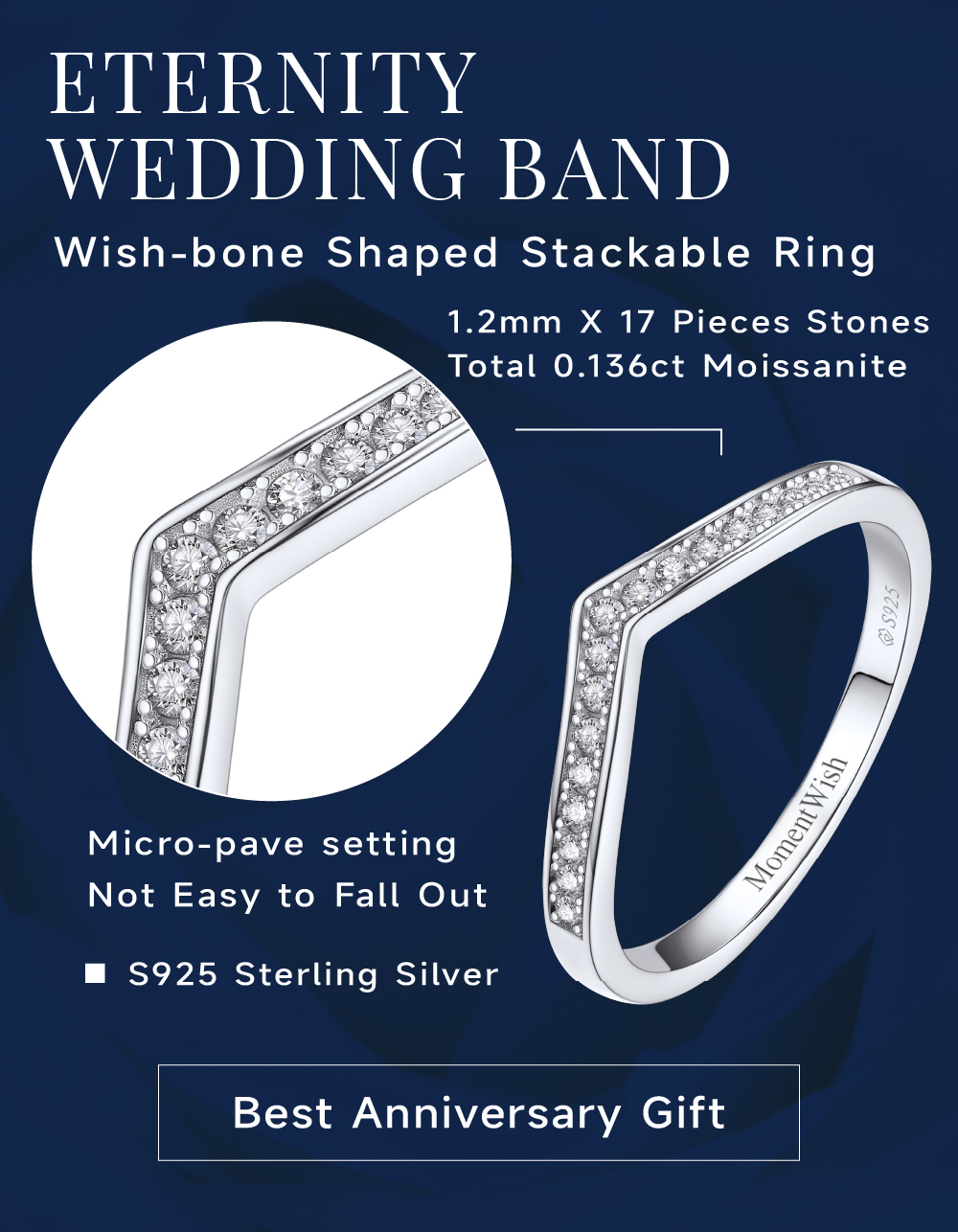 【Precious Material】➣Classic band design of wedding ring for women is made with S925 sterling silver, retains its white color longer. D color VVS1 moissanite. The anniversary ring for women has been polished manually, which is very comfortable to wear it every and will not scratch your skin or rub your engagement ring. Lead and nickel free, hypoallergenic. Band width: 1.6-2mm; Thickness: 1.2-1.6mm. Total stone: 0.136 carat.